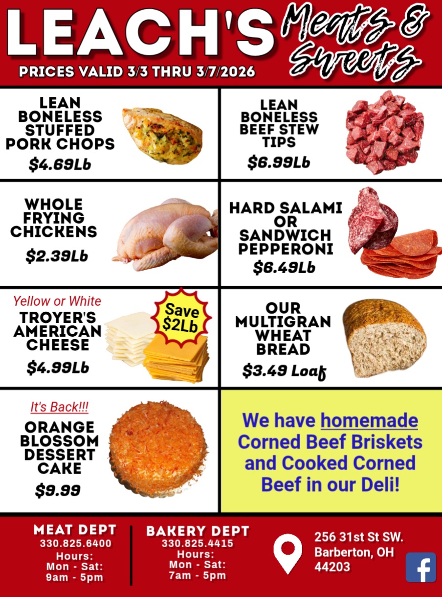 © 2026 Leach's Meats and Sweets - Meat, Bakery, and Catering - Barberton, Ohio. Created for free using WordPress and Colibri