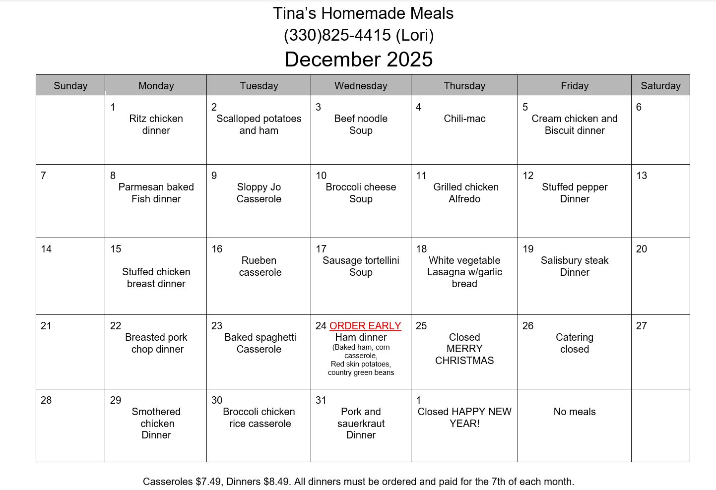 Casseroles $7.49, Dinners $8.49!