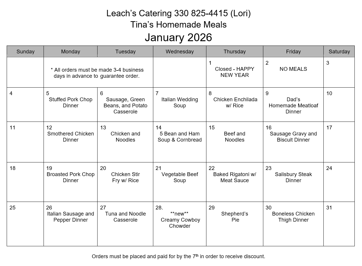To order, call Leach’s Catering at 330.825.6400